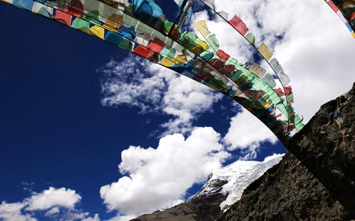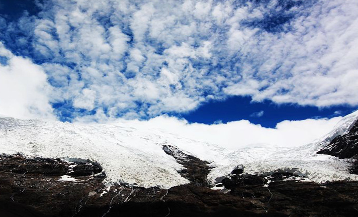 位于西藏浪卡子縣與江孜縣的交界處,乃欽康桑峰南坡,距江孜縣城75公里,為年楚河源頭之一。冰川上部為一坡度較緩的冰帽,下部為兩個呈懸冰川形式的冰舌。東冰舌長3公里,寬750米,冰舌末端高5233米;西冰舌長4.5公里,寬1.5公里,冰舌末端高5145米。整個冰川面積為9.4平方公里。冰川前緣由于基巖山丘起伏,促使冰舌前緣緩慢移動的冰層頂部發(fā)生張裂。冰雪沿冰層張裂消融,形成壯麗多姿的冰塔林。在冰塔林上由于雪塵相間顯示出各種云卷狀的奇異褶曲,猶如能工巧匠精心細雕的花紋圖案。在冰舌前緣的基巖冰蝕臺地上可見數(shù)條長達10余米、寬10-20厘米、深8-10厘米的楔型刮痕平行分布,這是其它冰川罕見的跡象,形如"創(chuàng)床"的導軌,使人贊嘆大自然的魅力.